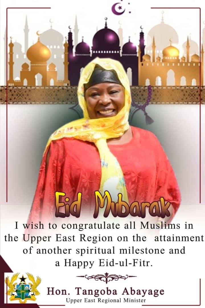 “It has been another one holy mouth of prayer, fasting and alma giving by Muslim of all sets across the world. The period is one of the most important events on the Islamic calendar which all Muslims are enjoined by the Holy Prophet Mohammed ( peace be upon Him) to observe. As the solemn period comes to an end, I wish to congratulate all Muslims in the Upper East Region on the attainment of another spiritual milestone. Surely , we have matured in our spirituality over the period, drawing us closer and acceptable to the Holy Prophet Mohammed ( Peace be uponHim) and our neighbors” She said.