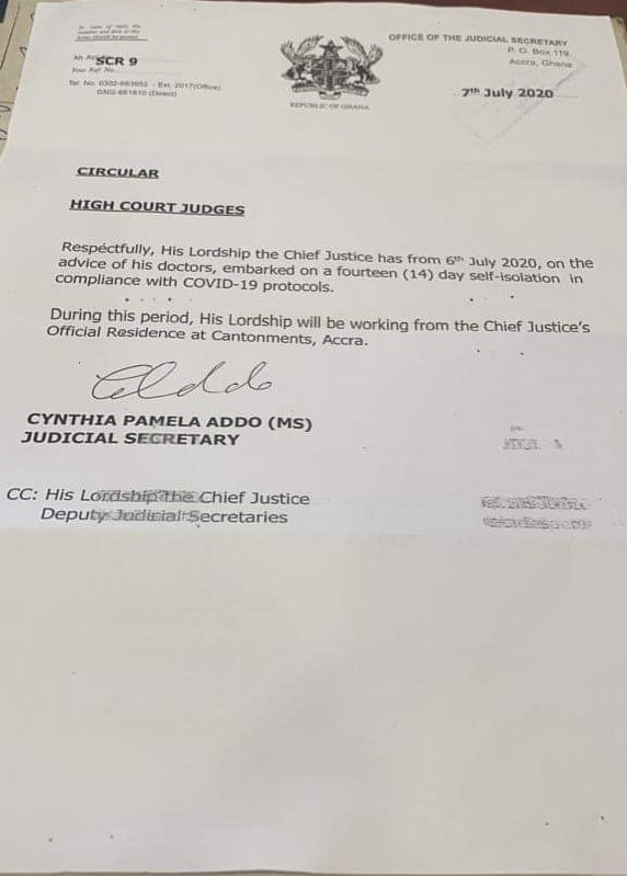 In a circular sighted by A1 News, the Chief Justice began his isolation from July 6, 2020.