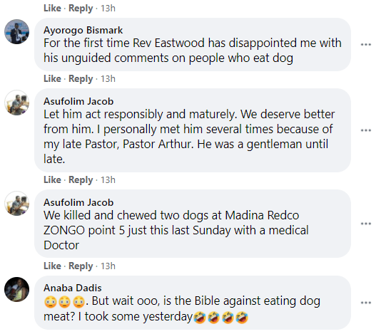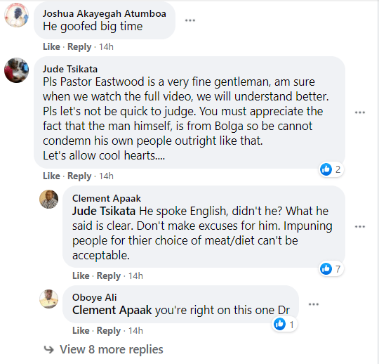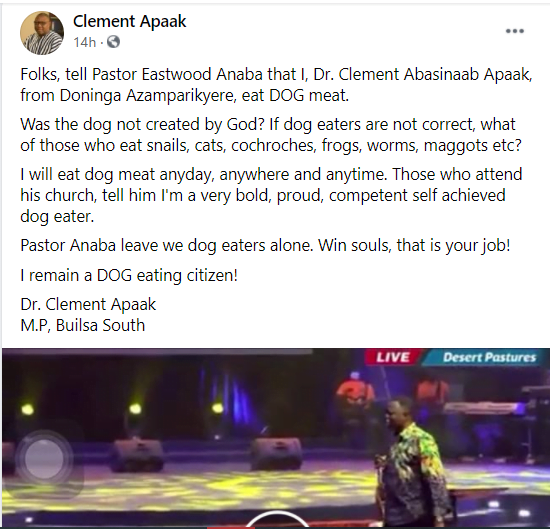 “Why don’t you take the pain to go and listen to the full video of Reverend Eastwood. Some of you have concluded that he has insulted people who take dog and donkey meat. It is not fair in my view; it is not fair. He was speaking on the topic, “The Deity of the Holy Ghost”. Yesterday I scouted through the video to see what prompted the circulation of that video on social media; that one was an excerpt of what he was saying.”