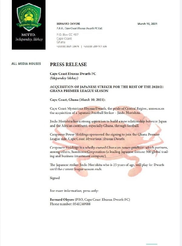 Ebusua Dwarfs have confirmed the signing of Japanese striker Jindo Morishita for the rest of the season.