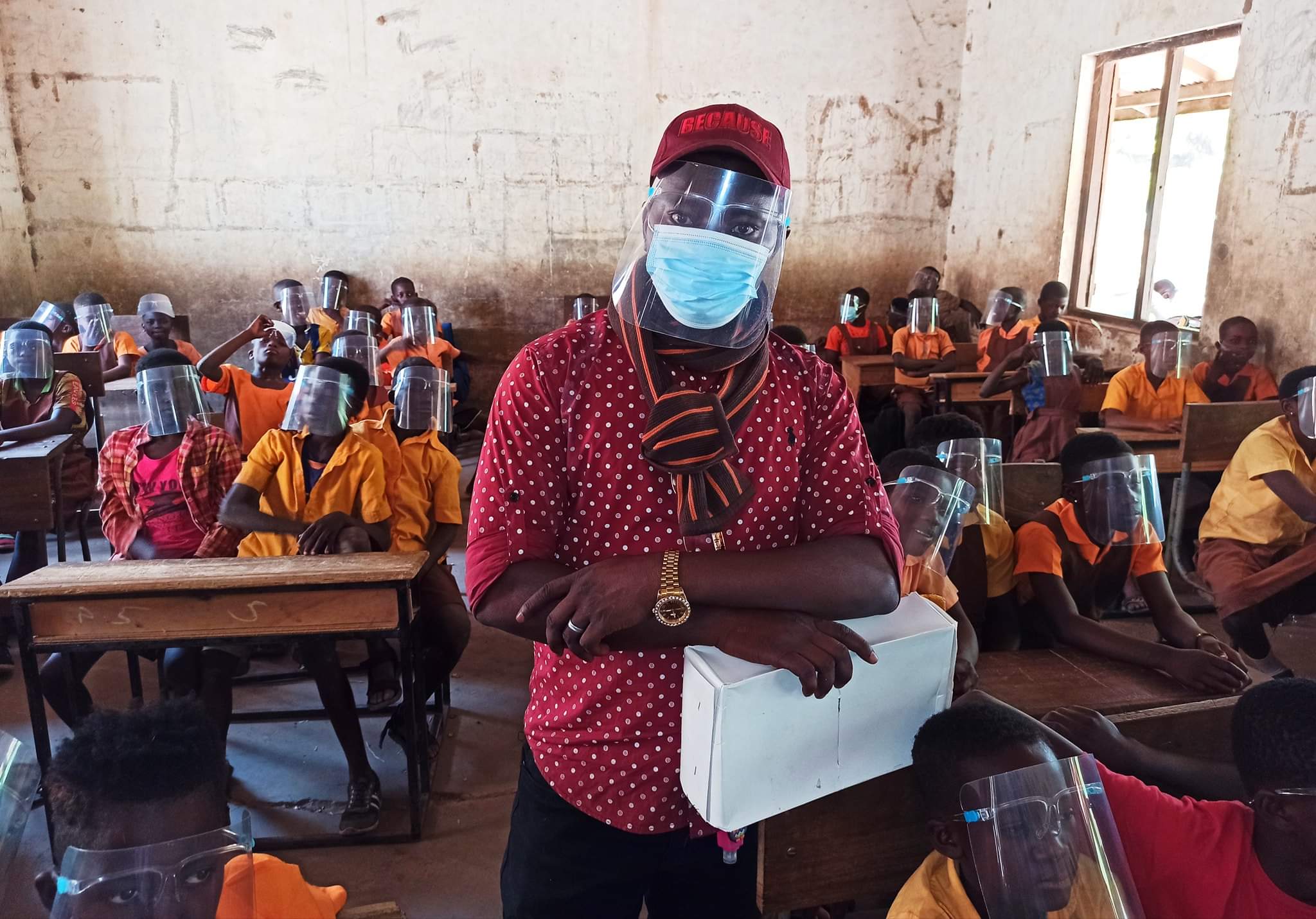 The teacher,Kampoe Desmond sacrificed his meagre teaching salary to procure and distribute nose masks and face shields to pupils he teach at Naaga Primary school.