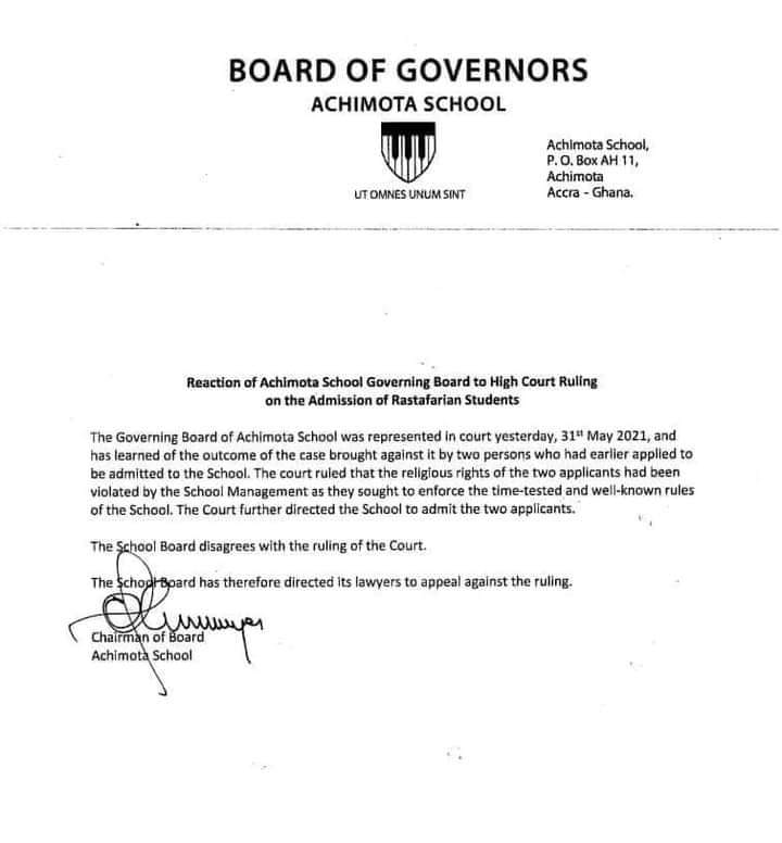 Achimota school through it’s board of governors have decided to appeal the decision by the high court to admit the two Rastafarian students.