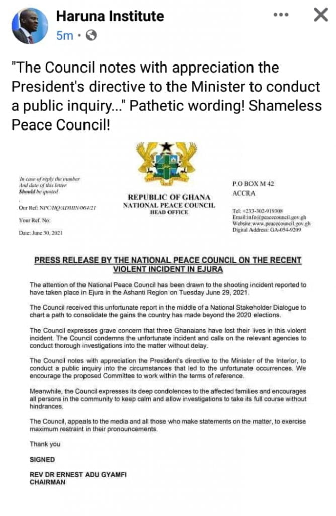 The Minority leader on his Facebook page noted that the peace council’s press release that appreciated the President’s directive was nothing but pathetic wording and shameful to the council’s own self and Ghanaians in general.