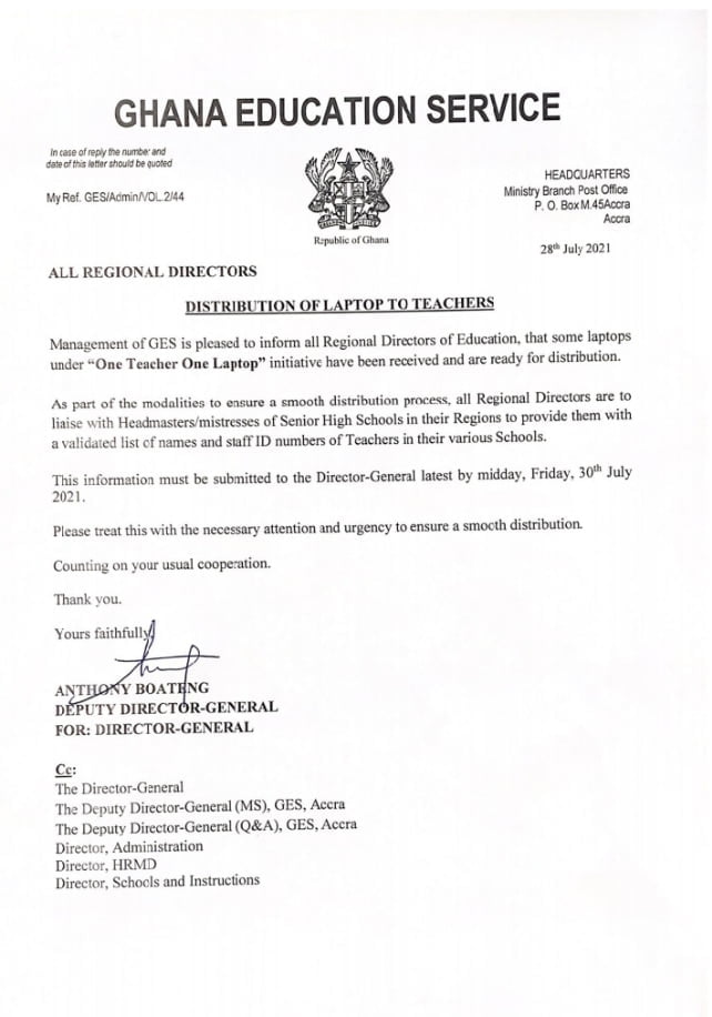 The statement in parts reads “As part of the modalities to ensure a smooth distribution process, all Regional Directors are to liaise with Headmasters/mistress of Senior High Schools in their Regions to provide them with a validated list of names and staff ID numbers of Teachers in their various Schools.”