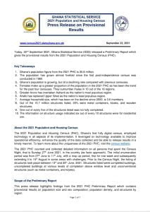 The statement indicates that Ghana’s population is growing, but at a declining rate as compared with previous censuses; adding that “Females make up a greater proportion of the population in the 2021 PHC as has been the trend for the past four censuses. They outnumber makes in 10 out of the 16 regions.”