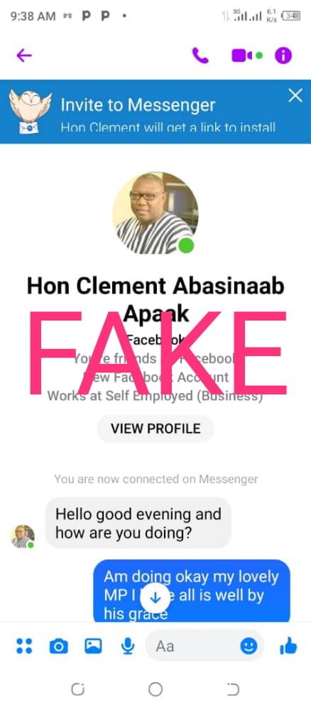 “My attention has been drawn to a FAKE Facebook account with my name and images (Hon. Clement Abasinaab Apaak). Note that the account (screenshot) shown below, is fake, and has been created by a fraudster to defraud unsuspecting friends, colleagues, associates, citizens, and constituents. Don’t allow yourself to be defrauded. I have only one Facebook account, this one (Clement Apaak). The impersonator claims that one Alex Akoto with telephone number 0544827298, is my aide. Not true. I have only one aide ( Samson Samari, with telephone number 0247016819) I don’t know anyone any Alex Akoto. If you have already become a victim of the fraudster please report it to the police. I have filed a complaint to the police to investigate, apprehend and prosecute the fraudster using my name and images to dupe unsuspecting members of society. Be warned please, and feel free to pass this disclaimer on.