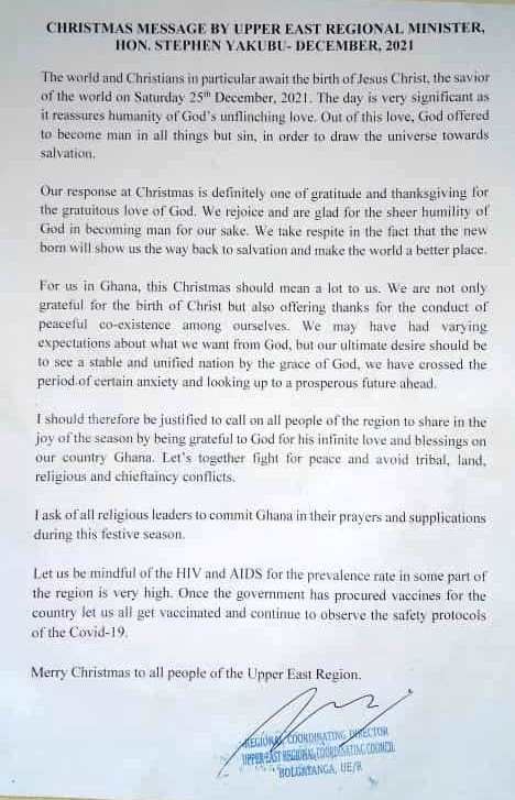 In a statement signed by the Minister and copied to A1 Radio, Mr. Yakubu urged all citizens of the region to take advantage of the blessings that accompany the season to demonstrate love to all persons regardless of their political or religious affiliations.