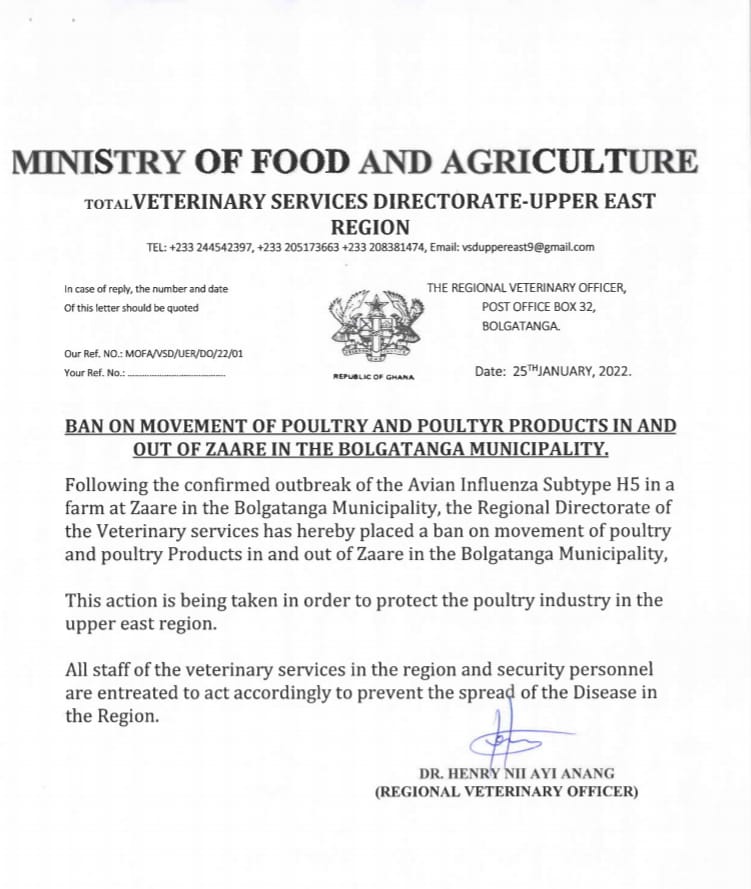 In a statement signed by the Regional Veterinary Officer Henry Nii Ayi Anang, the decision was taken after a confirmation of an outbreak of Avian Influenza Subtype H5 in a farm at Zaare in the Bolgatanga Municipality.