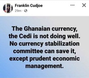 “The Ghanaian currency, the Cedi is not doing well. No currency stabilization committee can save it, except prudent economic management,” he wrote on his Facebook wall.