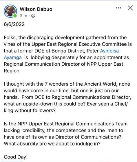 To confirm what our sources have confided in us, a member of the party, Wilson Dabuo has posted on Facebook expressing his dismay that the former DCE who was rising in his political career will stand so low to be appointed as a Regional Communications Director.