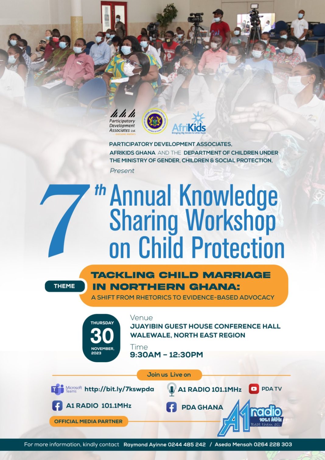 In commemorating the International Children’s Day on November 20, Participatory Development Associates (PDA), in partnership with Afrikids Ghana, the Department of Children, and A1 Radio, are set to host the 7th Annual Knowledge Sharing Workshop on Child Protection. The event, scheduled for Thursday, November 30, 2023, at the Juayibin Guest House Conference Hall in Walewale, will shed light on the critical issue of child marriage in Northern Ghana.