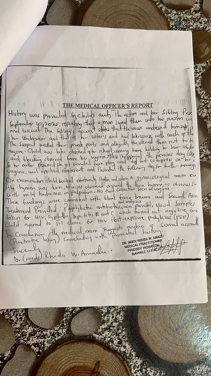 The medical report signed by Dr. (Med) Rhoda W. Amadu and sighted by A1 Radio confirmed evidence of a torn hymen, bruises, and tenderness consistent with sexual assault and penetrative injury.
