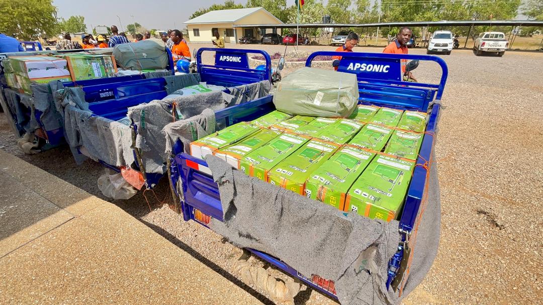 Items donated to the Talensi, Nabdam, Bongo, Bolgatanga East, and Kassena-Nankana West districts include 6 motor tricycles (Motor Kings), 60 Knapsack sprayers, and 80 pairs of Wellington Boots. The rest are 100 cutlasses, 5 high-density mattresses, and 20 bags of fertilizer.