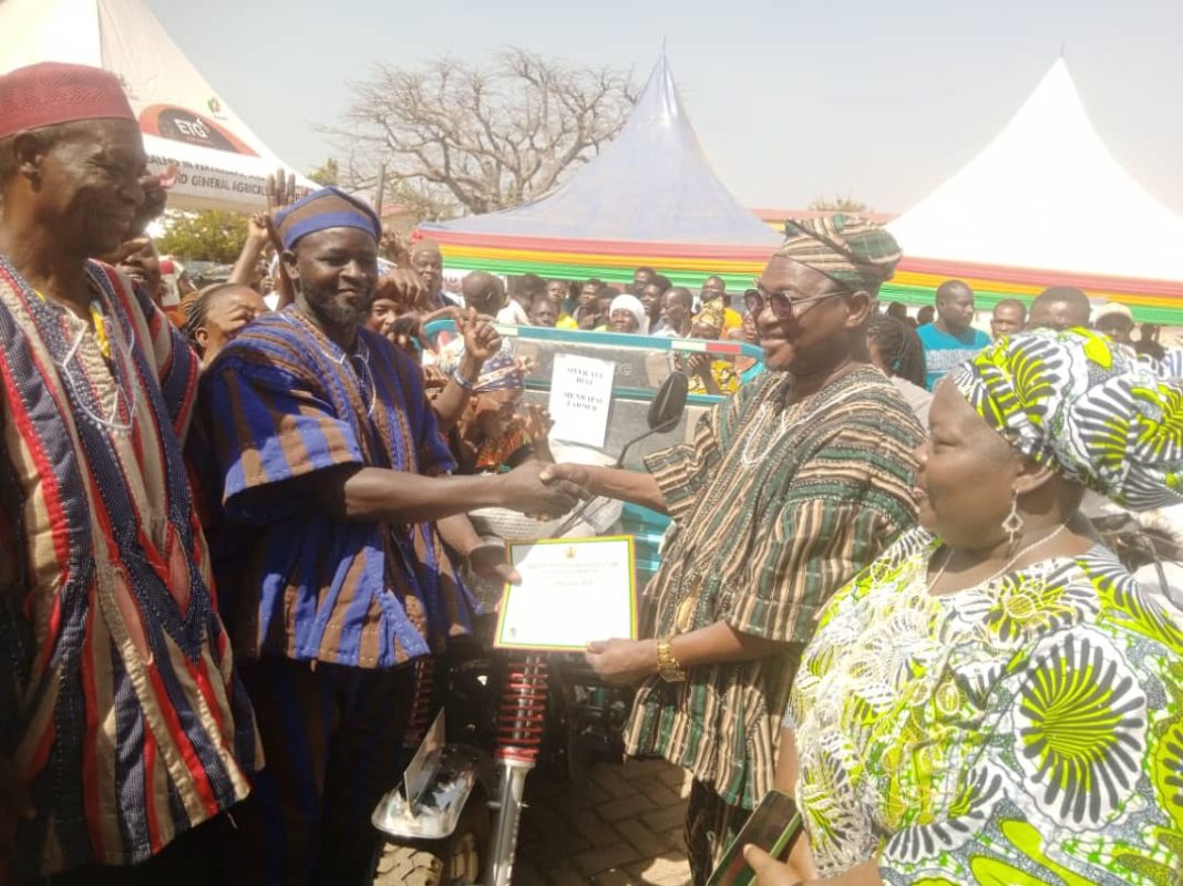 As the municipal best farmer, Mr. Atogutue received a Motorking tricycle, two bars of Keysoap, a knapsack sprayer, two pairs of Wellington boots, cloth, three bags of YARA fertilizer, two OFA products, and a certificate.