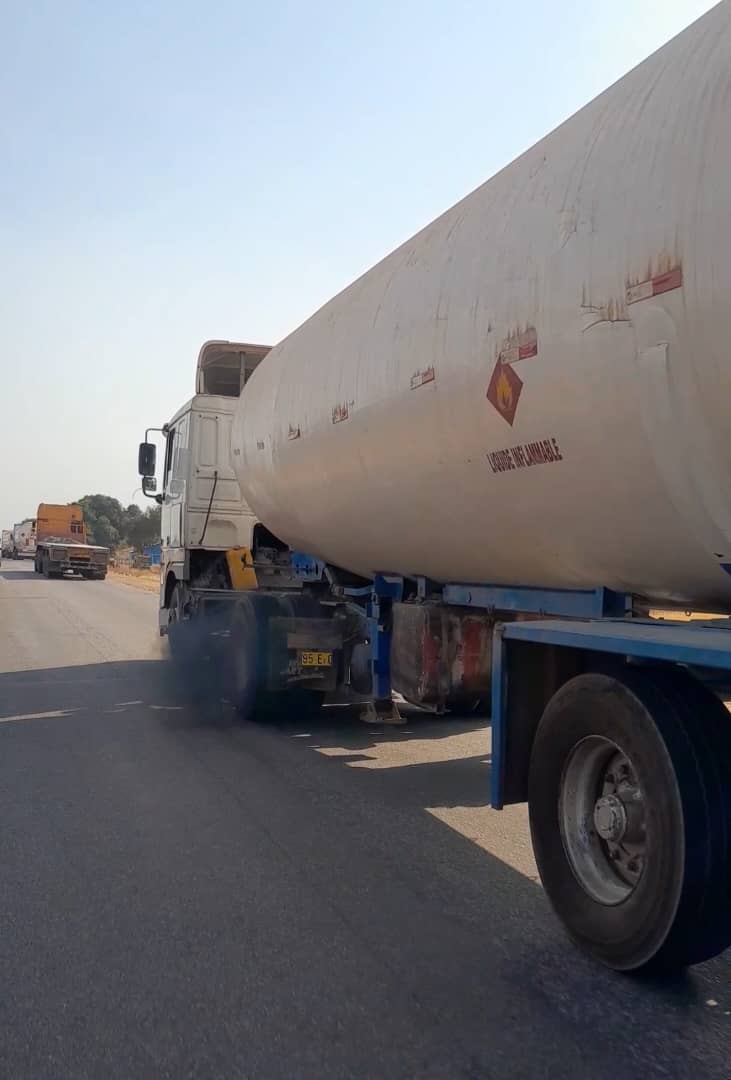 A truck with thick black smoke as it moves along the Bolgatanga-Paga Highway