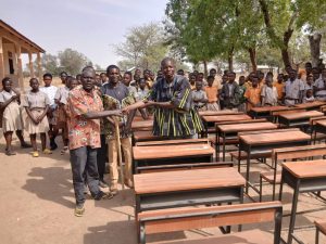Distribution was guided by need and urgency, with Ayone Primary School receiving 40 desks, Gambrongo Primary School 20, and Gambrongo Junior High School 17.